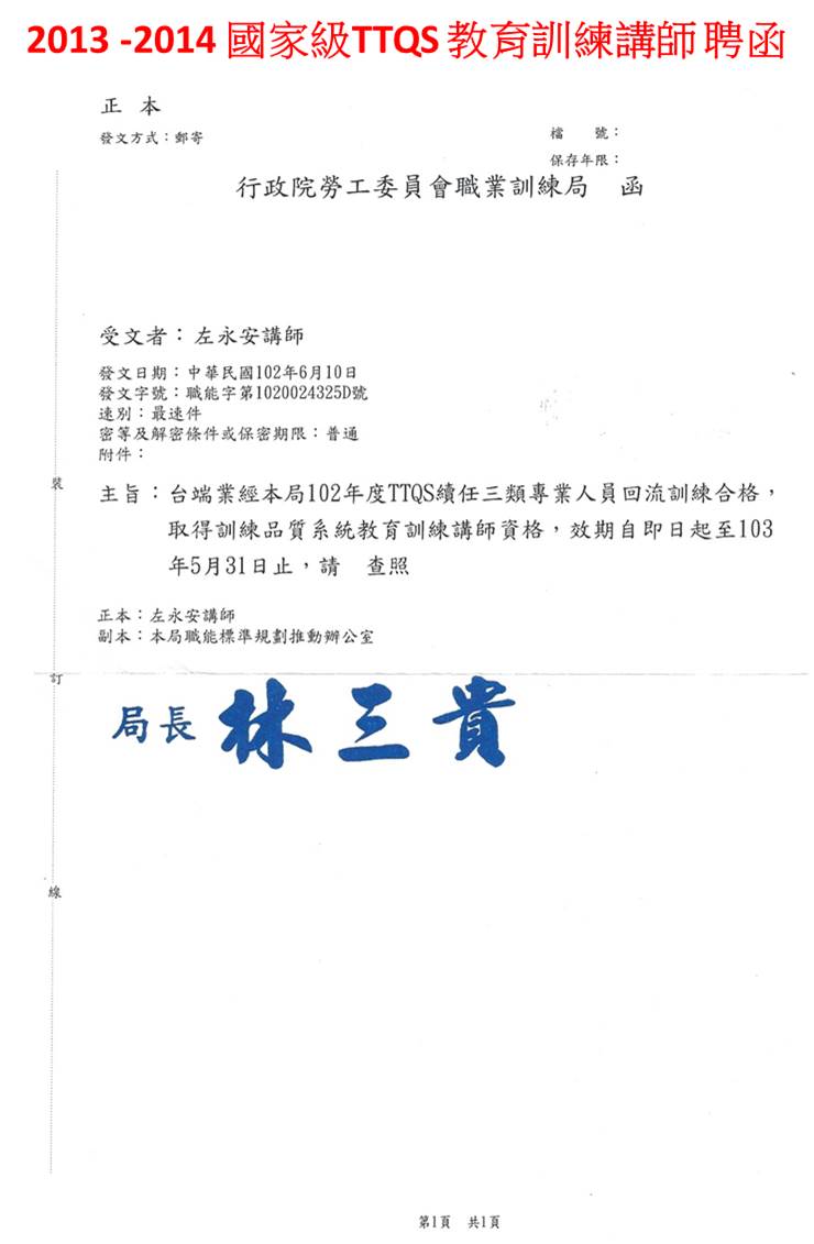 102 103 年 左永安顧問 安永經營管理商學院 EMBA 共通核心職能 人力資源發展 HRD EAPs TTQS 2013 -2014 國家級TTQS 輔導顧問 聘函 2013 -2014 國家級TTQS 教育訓練講師 聘函 張貼者: 安永歐洲經營學院 左記歐洲商行